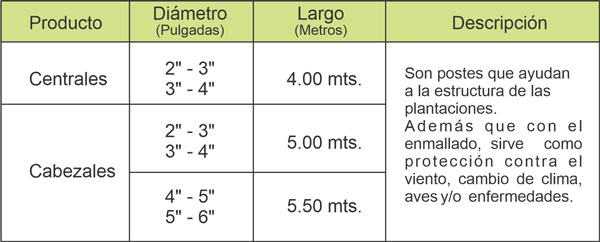 Comercializamos un producto Impregnado con sales (CCA), para las empresas dedicadas al sector agrícola (parrones y enmallados), avícola (estructuras para la construcción de granjas para crianza de aves) y construcción (estructuras).